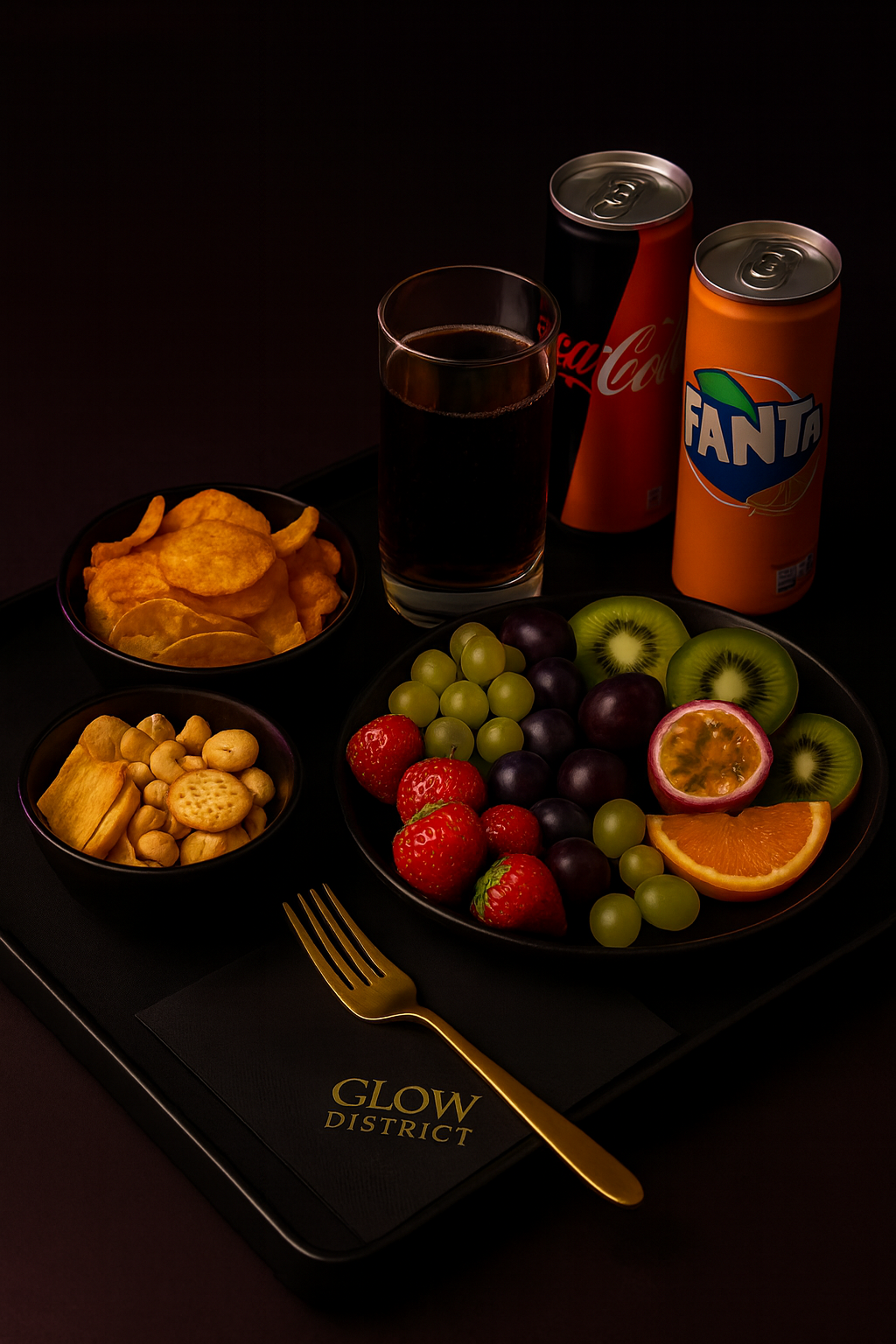 Eine erfrischende Cola, eine fruchtige Fanta, dazu eine bunte Obstplatte mit frischen Früchten und eine Knabberplatte mit Chips, Nüssen und Crackern.