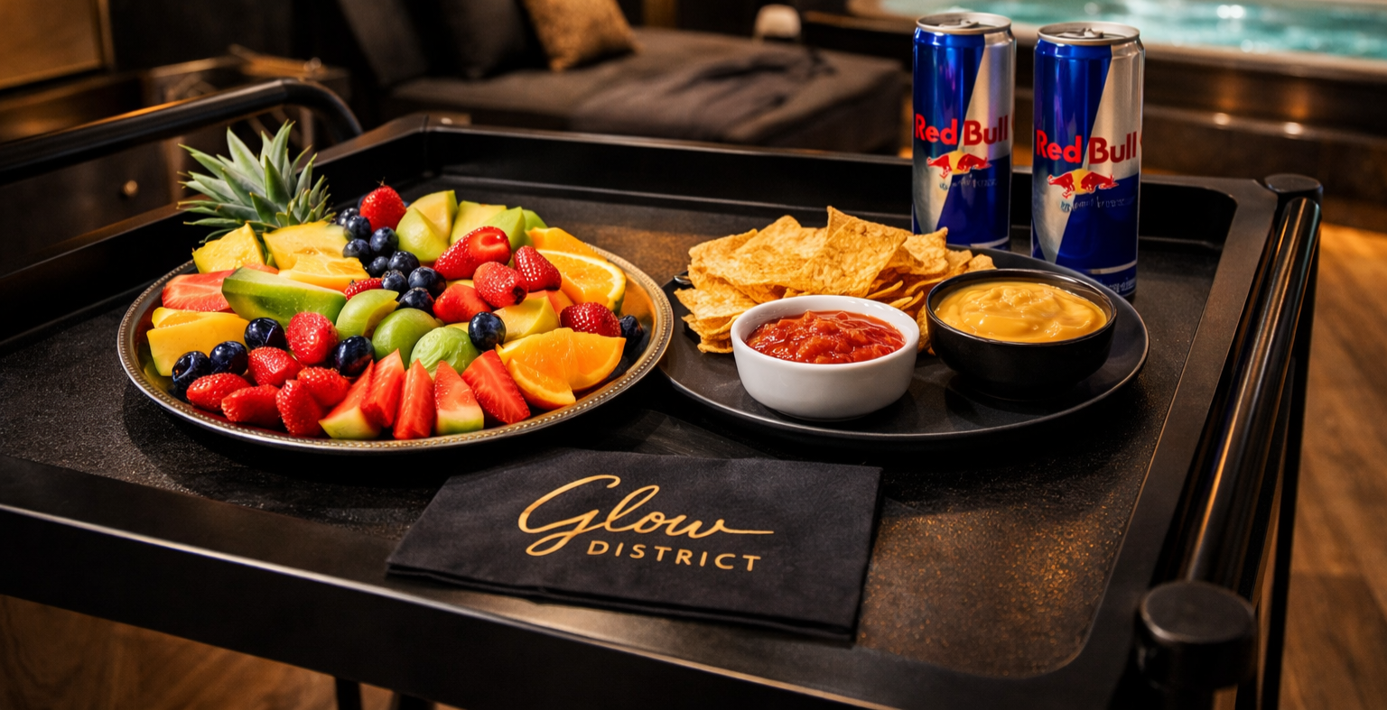 Zwei eiskalte Red Bull Dosen, eine liebevoll angerichtete Obstplatte mit frischen Früchten und einer Nacho Platte mit cremigem Cheese Dip sowie mildem Salsa Dip.