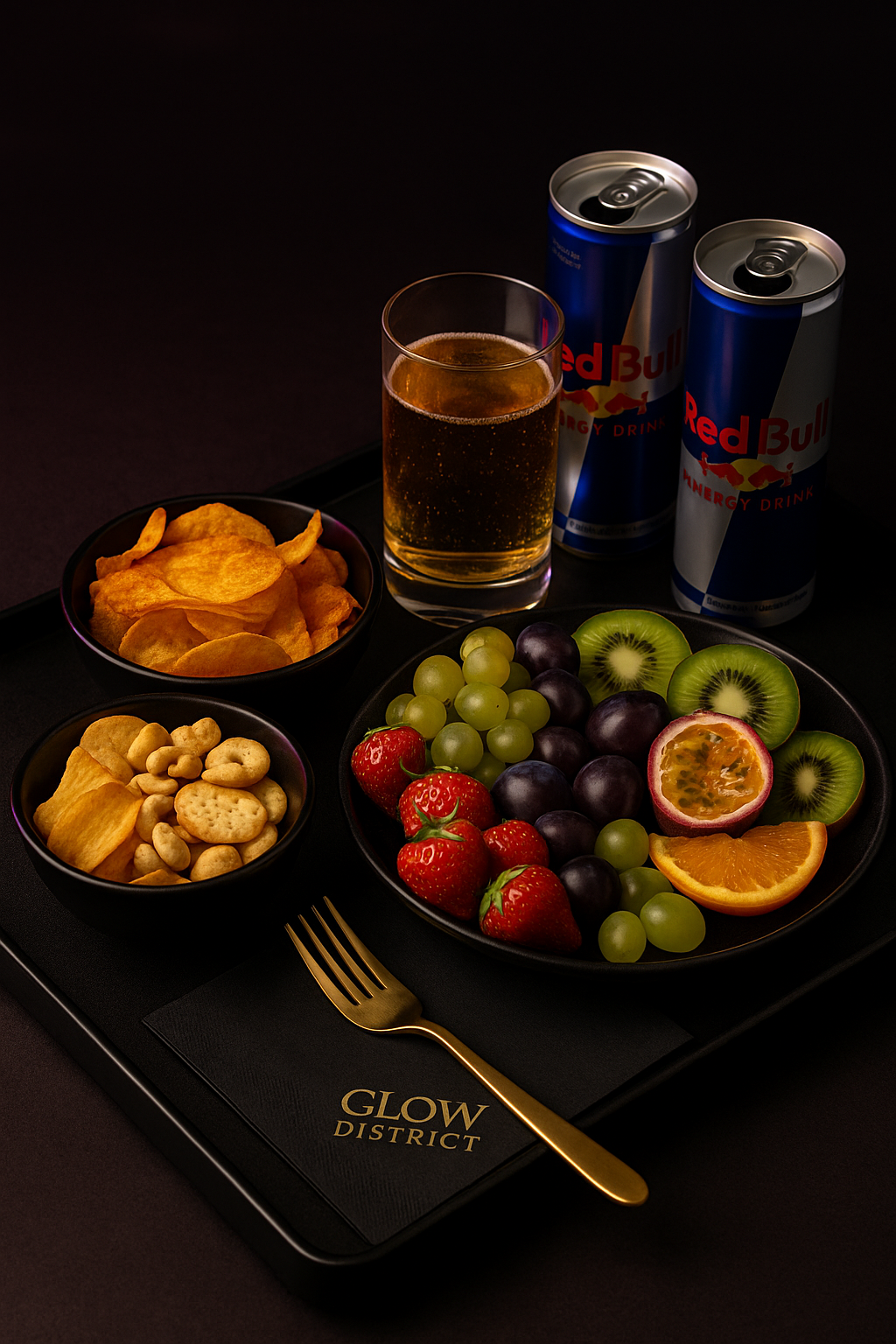 Zwei eiskalte Red Bull Dosen, eine liebevoll angerichtete Obstplatte mit frischen Früchten und eine Knabberplatte mit Chips, Nüssen und Crackern warten auf dich.