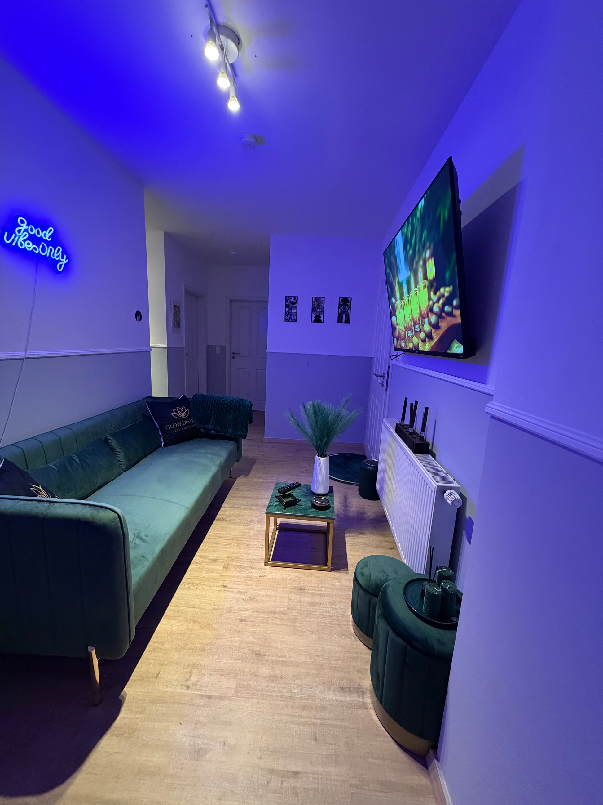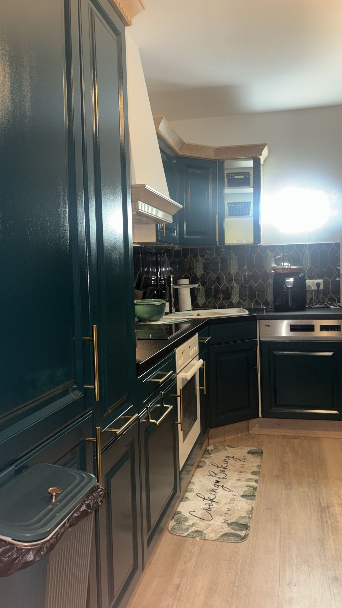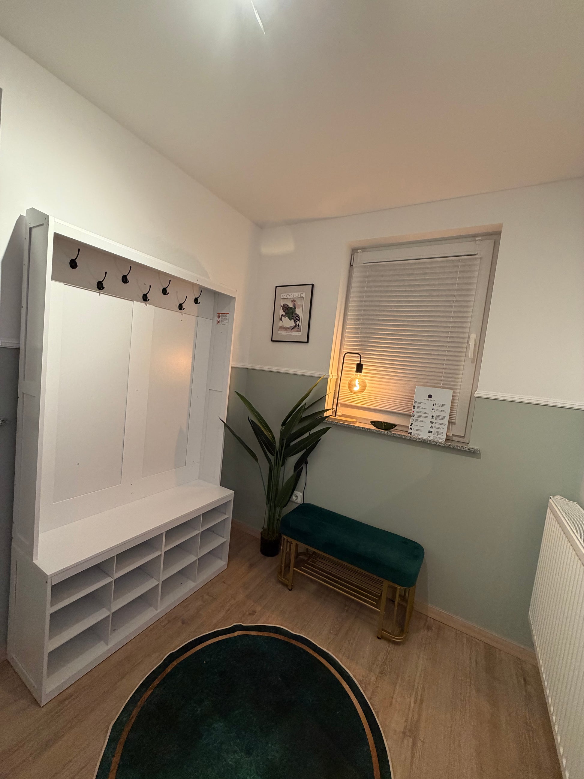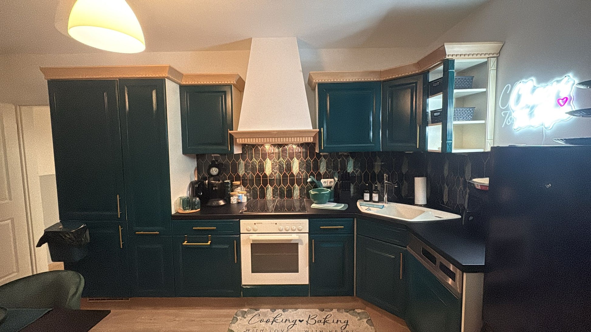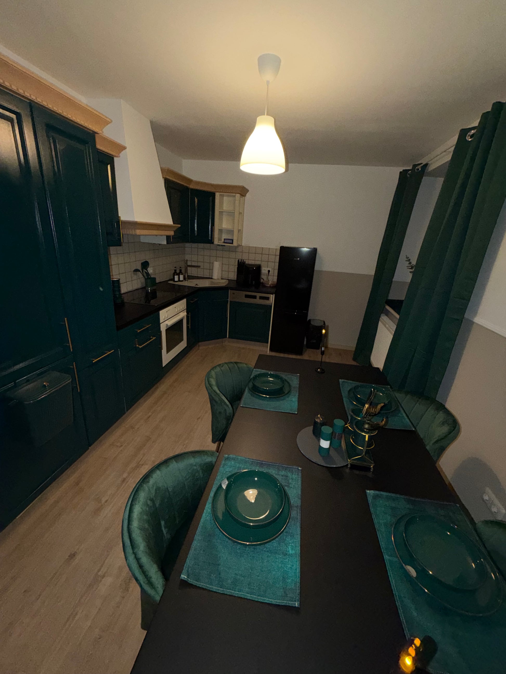 Eine rund 80 Quadratmeter große Luxuswohnung mit eigenem Eingang, alles niegelnagelneu und in edlem Smaragdgrün, Beige und Gold gestaltet.