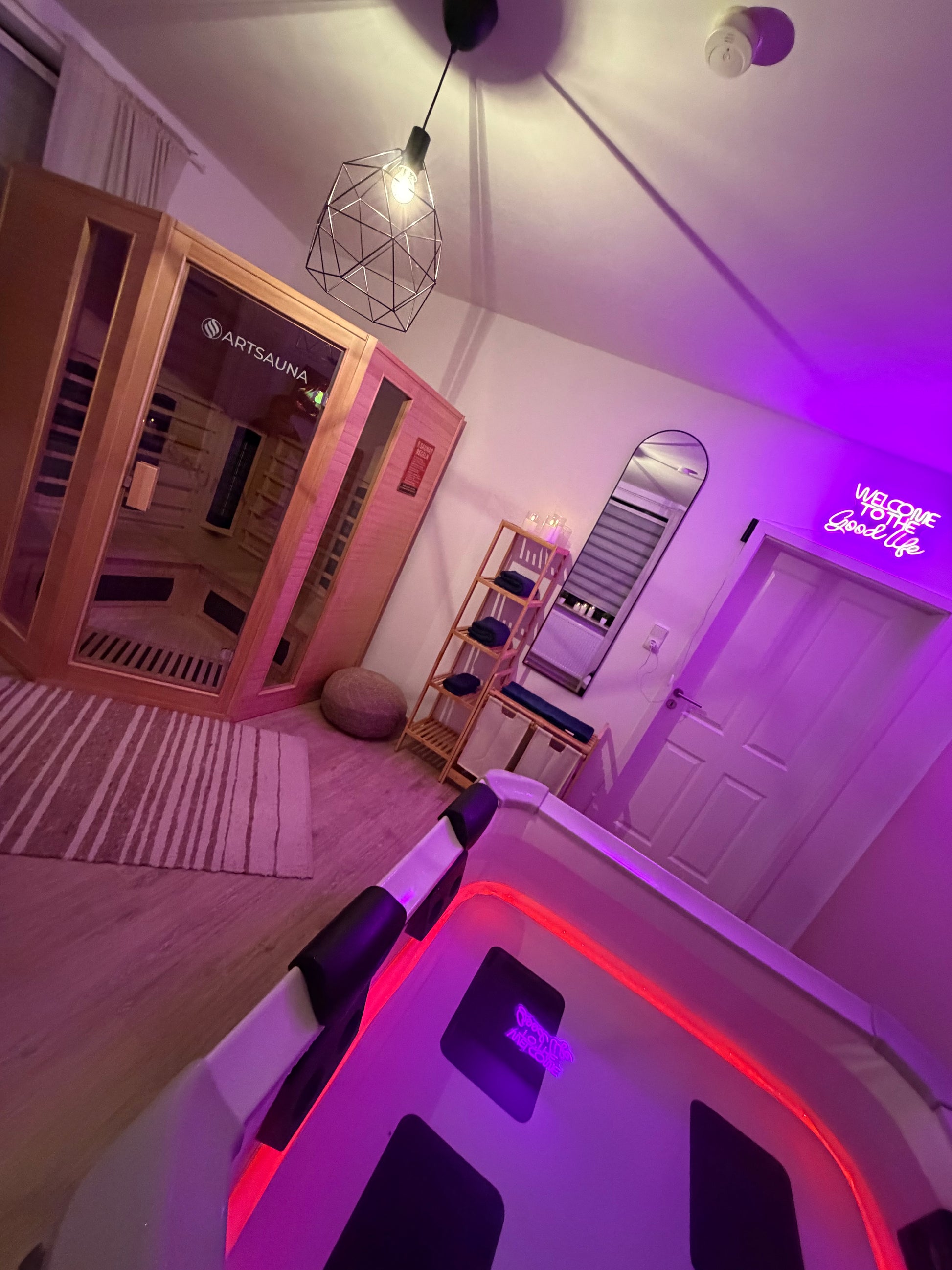 Der private Spa-Bereich befindet sich direkt in der Wohnung und besteht aus einem Raum mit großem beheizbarem Jacuzzi und moderner Infrarot Sauna und TV.